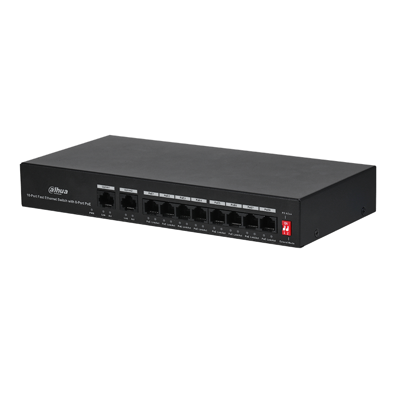 - Ethernet портове 8 × RJ-45 10/100 Mbps (PoE), 2 × RJ-45 10/100 Mbps (Uplink)